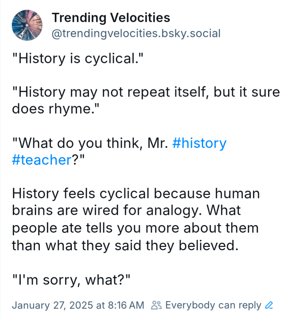 “You’re right, Michael Jackson was very upset about the British taxing Americans for their tea-hee,” I said, hitting Jackson’s high notes for those last two syllables.